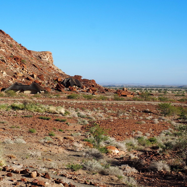 Dann ging es endlich in unser Zeltcamp. Zusammen mit Gerson, unserem Guide für die nächsten 2 Tage, fuhren wir den Grootberg wieder herunter und dann 10 Minuten entlang des ausgetrockneten Fußbetts des Klip-Rivers über holprige Schotterpiste. Bis wir dann endlich zu unserem Camp kamen.
