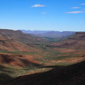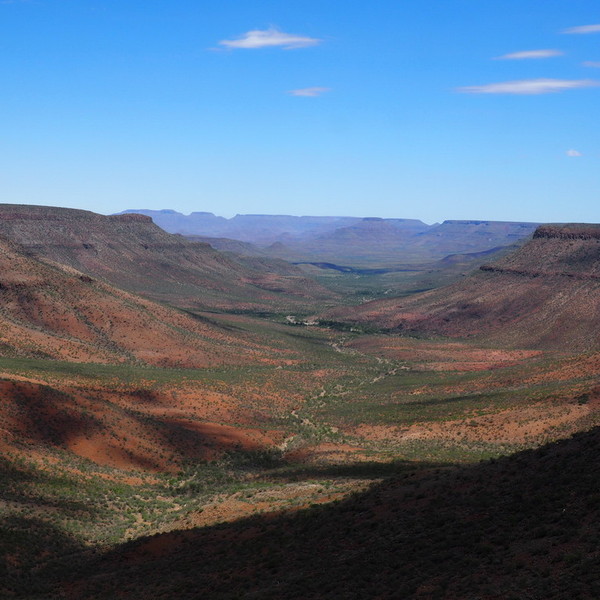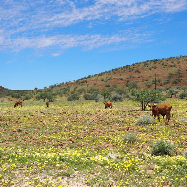 Nach dem Frühstück in unserer Lodge ging es weiter in Richtung Gebirge. Auf einer wirklich schönen Strecke – hinter jeder Kurve bot sich eine neue Landschaft. Sanddünen, Tafelberge, Geröll und manchmal gelb blühende Blumenwiesen.