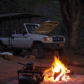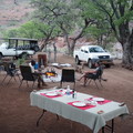 Hier wurden wir schon von einem knisternden Lagerfeuer und Ruben, unserem Campboy empfangen. Die Zelte sind einfach, aber sehen robust aus. Und das Ganze war extra für uns aufgebaut worden. Und so nutzen wir die schöne Stimmung und setzen uns erst einmal mit Gerson an das Lagerfeuer, während Ruben das Abendessen zubereitete und den Tisch deckte. Und dann verbrachten wir einen wirklich netten Abend mit den beiden – bei leckerem Essen vom Grill und ein paar interessanten Gesprächen zu Namibia.